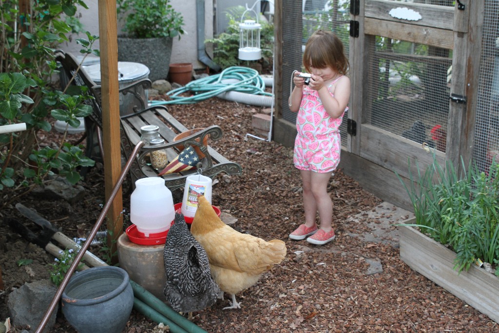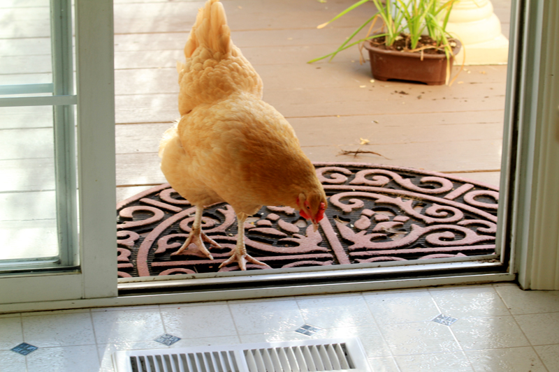 The new girls still sleep on the floor of the coop since the mean girls won’t let them on the sleeping roost, but they don’t seem to mind since they get free run of the yard (and sometimes when we’re not looking …the house) once a day as a special treat!