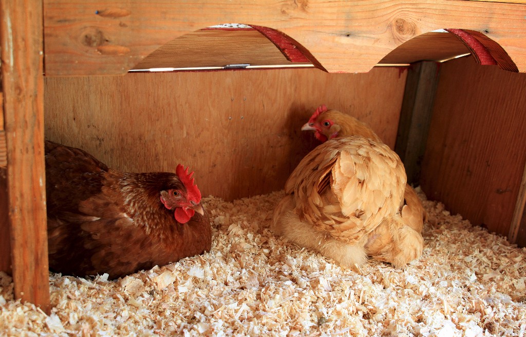 Little by little things got better. We installed a new roost in the run for the new girls ( a little higher than the old girl’s roost) and that gave them a safe place to land. We moved the water so it would be “new” for everyone. We let the new girls out to roam, since they were used to that, and it seemed to calm them down. And finally, one day in April, about a month after they arrived, when I went out to collect eggs…..there was Pebbles in the nesting area with Lucy, her toughest opponent. Pebbles is clearly keeping an eye on her but they seemed to have come to some kind of agreement!