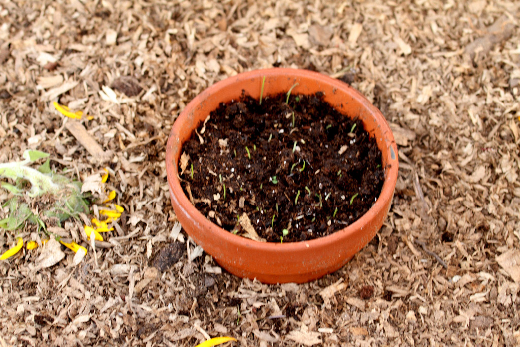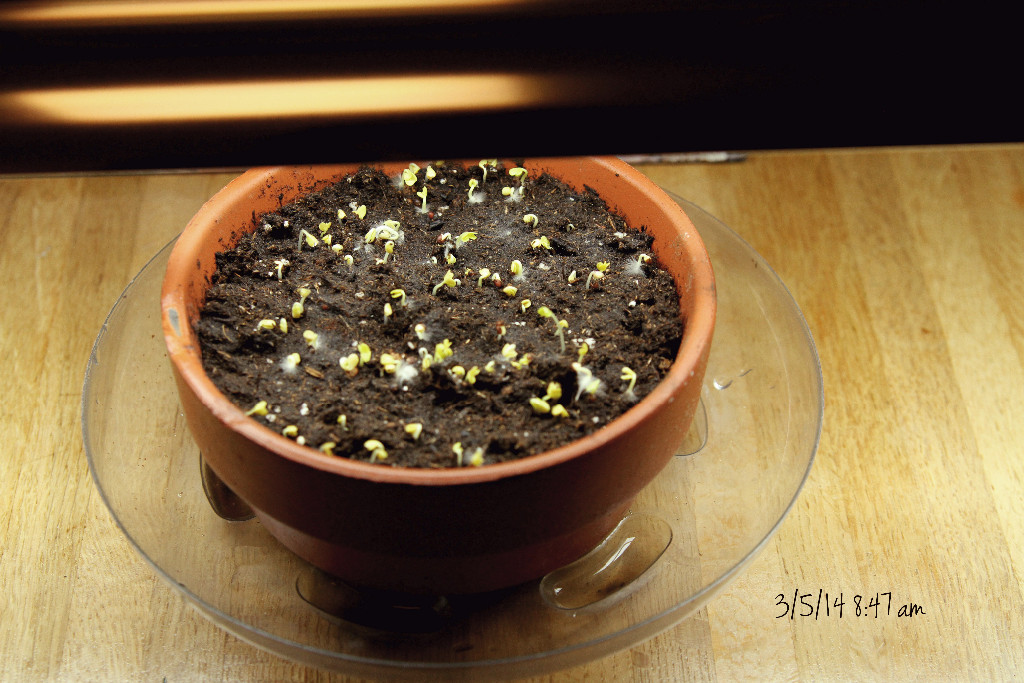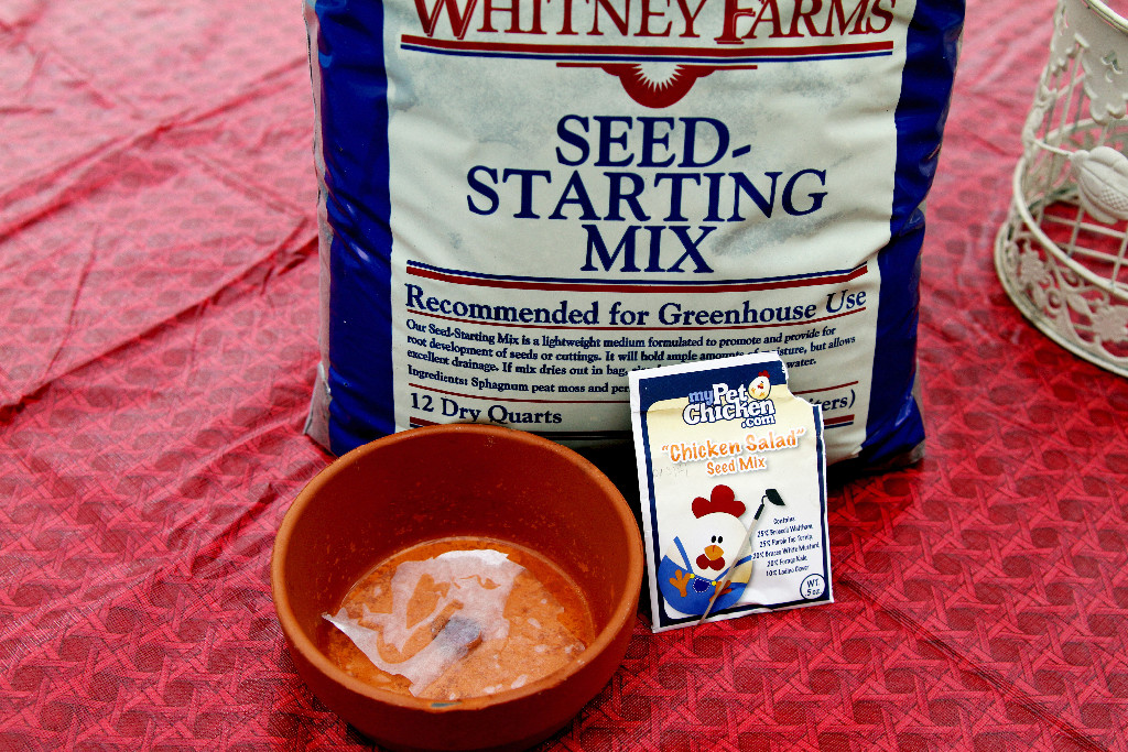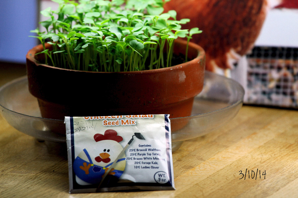 I ordered 10 packets of “Chicken Salad” Seed Mix from mypetchicken.com, bought some seed starting mix, a shallow clay pot (lined with a coffee filter) and got the seeds planted and placed in a sunny window: