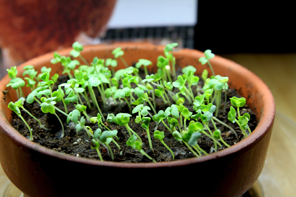 The first attempt in a sunny window started stretching toward the light and clearly lacked enough sun to grown properly: