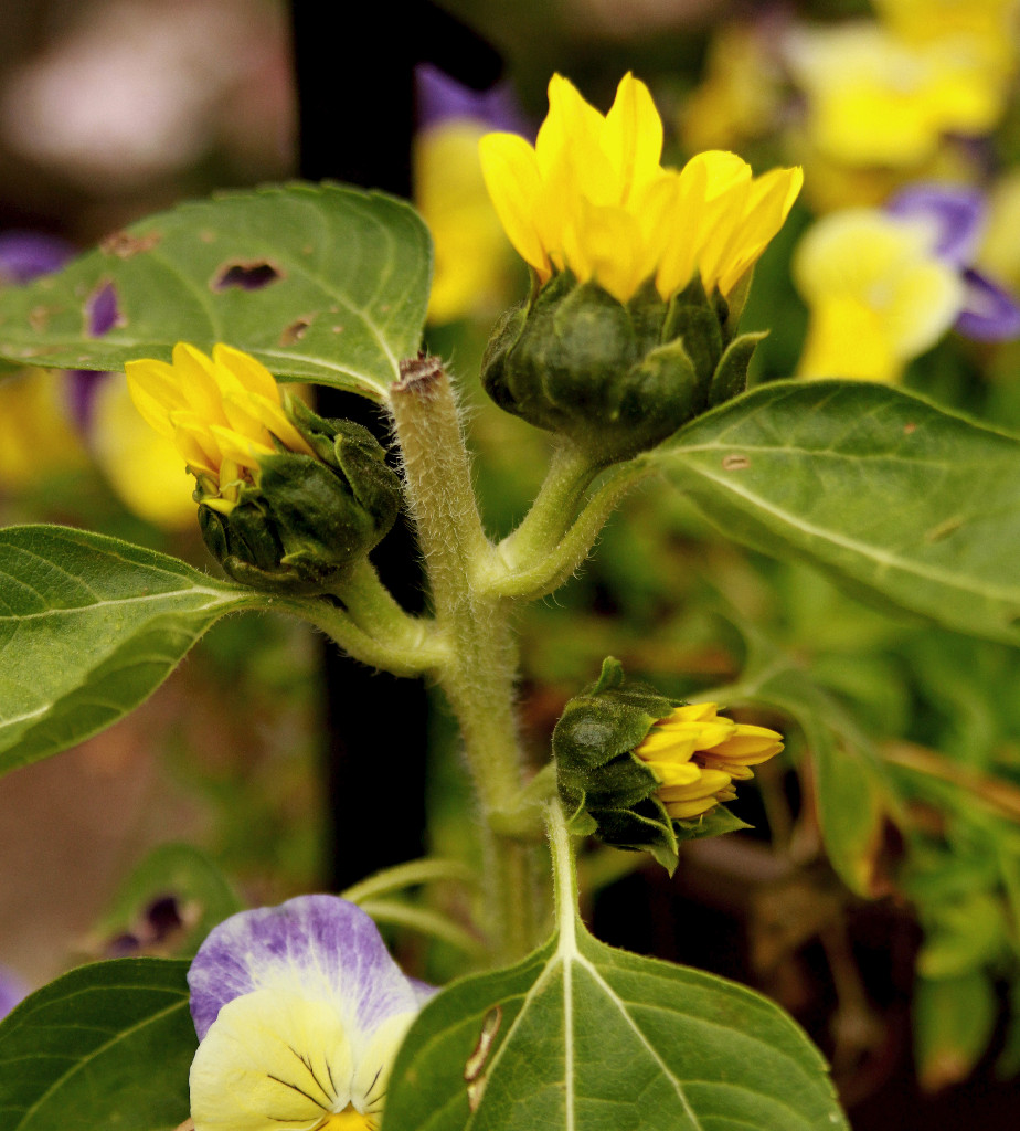 One of my plants had a nice bright sunflower on top but when it was done…that would be it.Then the birds cracked the stem trying to get at the seeds, so I cut it off to make it easier for them. By sacrificing that one big blossom look what I got in return! This isn’t a variety known for multi-branching but when all the energy sent to that one flashy girl was spread around a little I got a nice new crop of blossoms, all just as beautiful, though smaller.