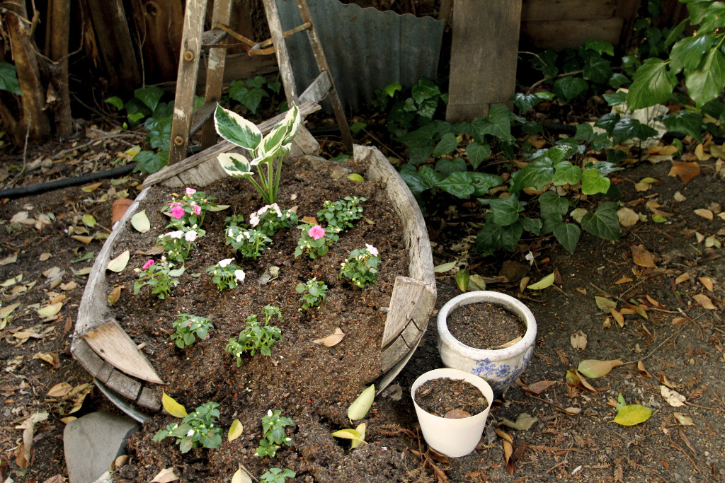When they moved in, a very old wine barrel was half buried under the back steps. She hauled it out, filled it with dirt and we added a hosta and some impatiens to brighten a shady corner!