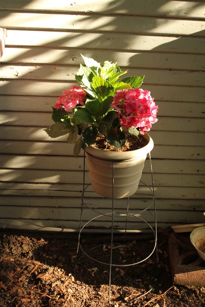 Cutting the bottom pieces off a tomato cage makes a nice holder for a potted hydrangea:
