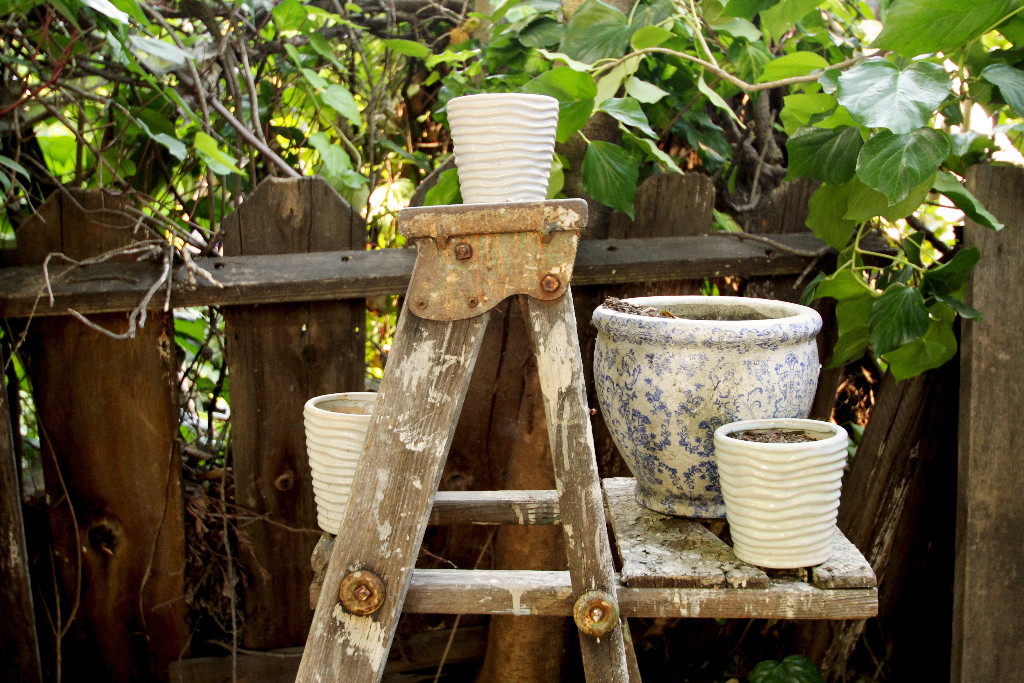 An old ladder found in the garage makes a nice display with a few pots…plants coming next!