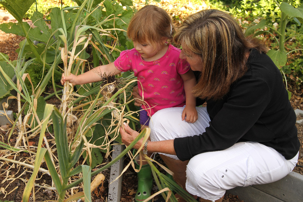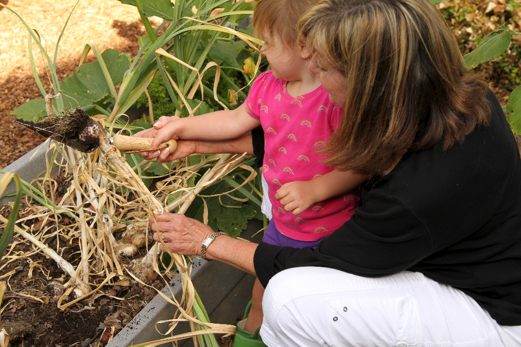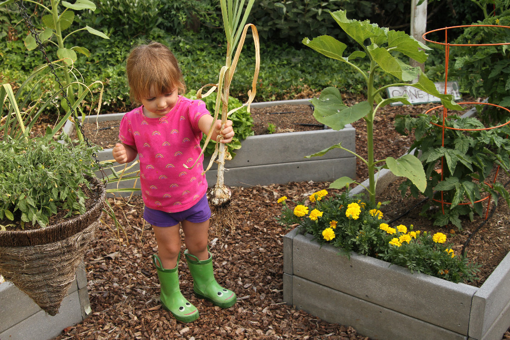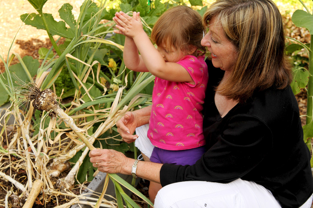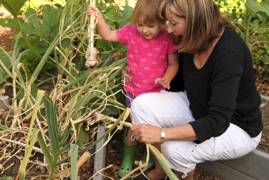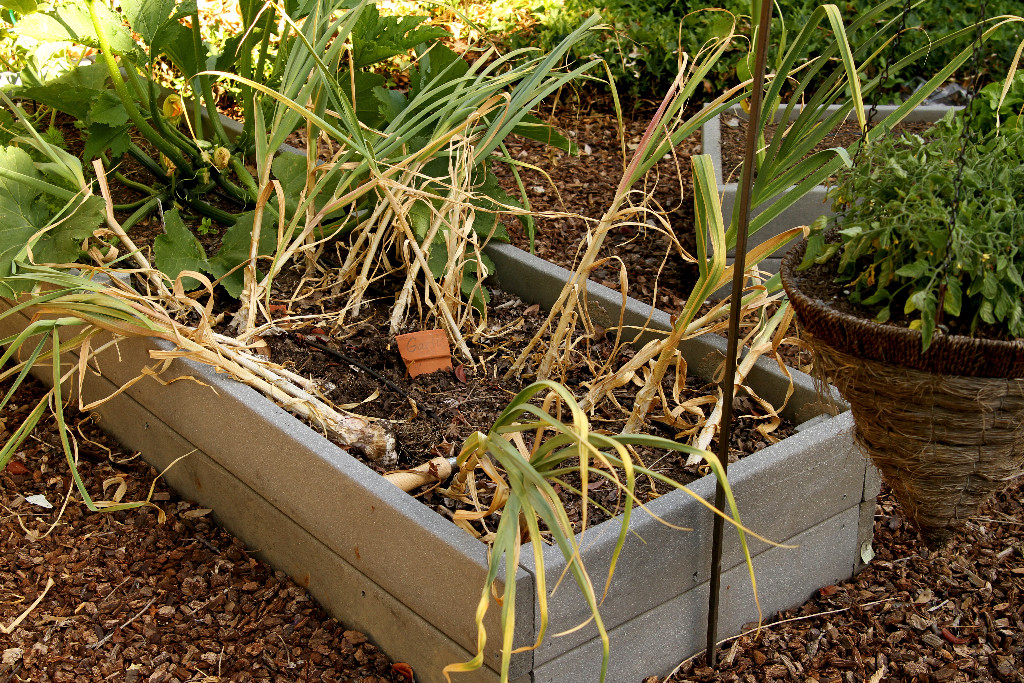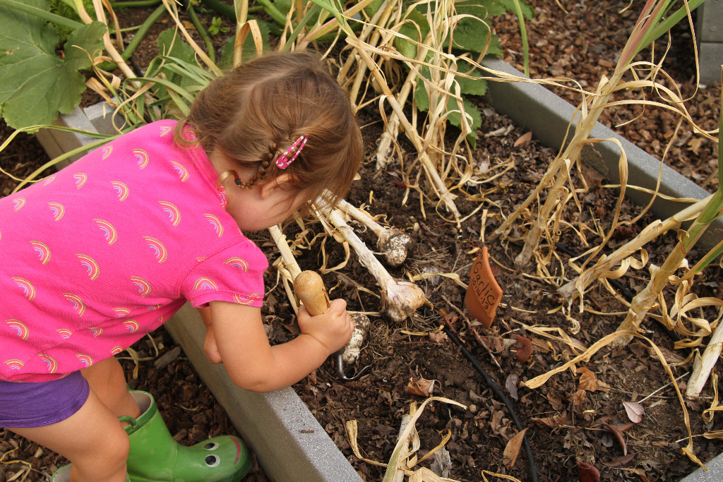 I’ve been waiting since last October to see what would become of the 20 little garlic cloves I planted in our raised beds. Since at least half the leaves were finally dried and the stalks had flopped over, today was the day to find out! Everything I read said using a trowel to loosen the garlic bulbs before pulling them out is a good idea. So, trowel in hand, I had my little garden helper dig up the first bulb…