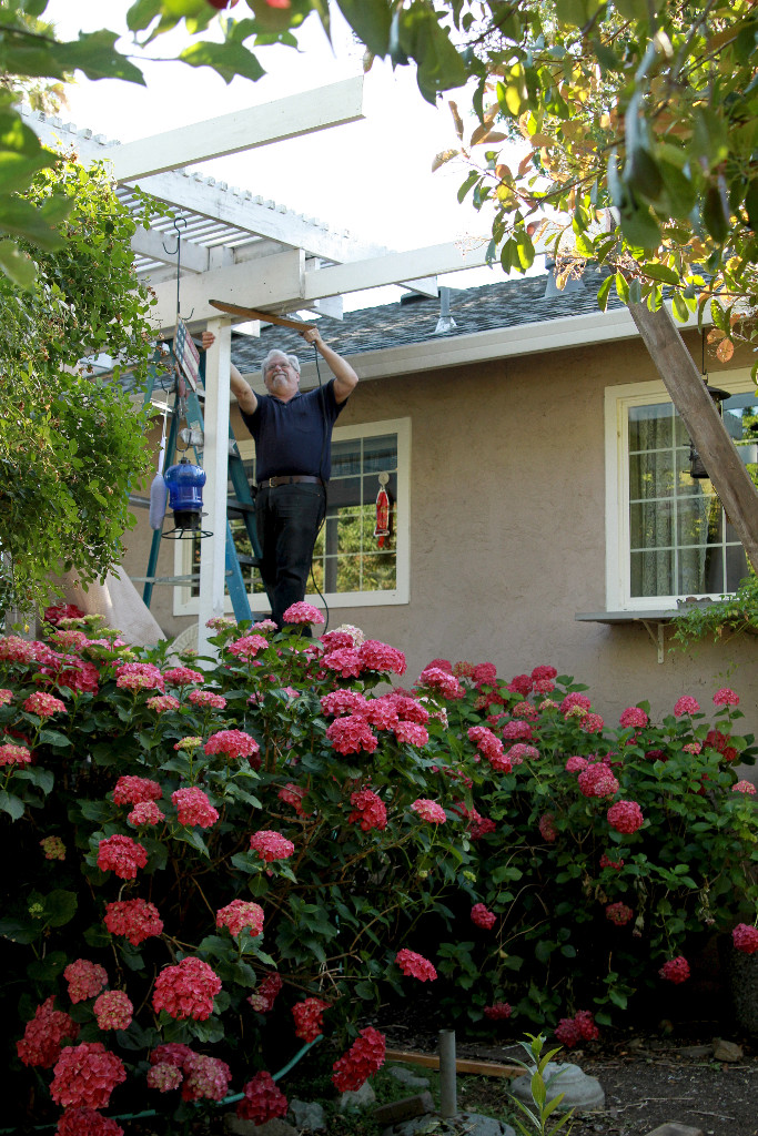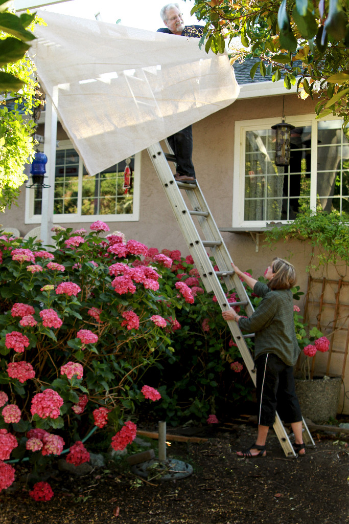 This time of year in Northern Calif. we often have sudden, scorching days….that’s a problem for hydrangeas. They do best with morning sun and afternoon shade. They don’t do as well against a stucco wall which reflects heat or in full afternoon sun unless it’s sun at a low angle in the very late afternoon. These past few weeks we’ve had triple digit temps and my plants were really getting scorched and I was really getting sad! Husband to the rescue! He saved my plants and has the scars to prove it! After falling off a ladder that tipped with him on top, he went back again and finished building a shade cloth overhang to save three beautiful plants that I’ve been growing around our deck since 1999. The Prezlosa, Red Star, and Buttons and Bows plants grew to nearly 5 feet tall and the mid-day and afternoon sun that missed them when they were small, was now burning the blossoms. Could you stand to see this beautiful Buttons and Bows plant get scorched?