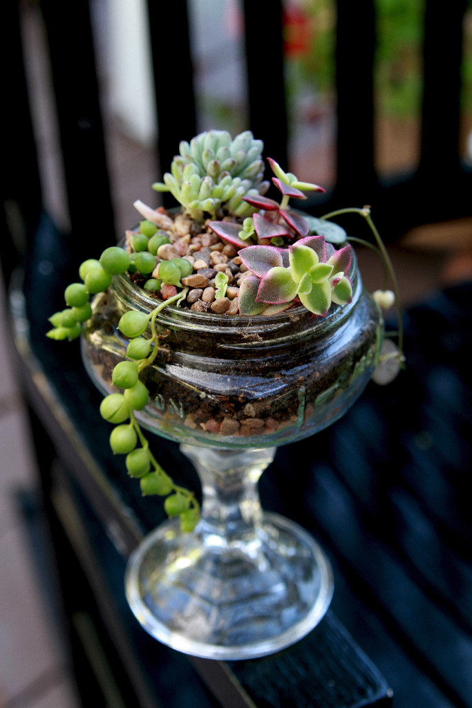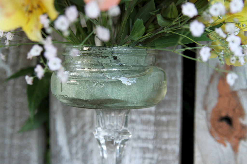 Walking through a vintage shop in Healdsburg I spotted a shallow Mason jar on a pedestal…it was labeled a “Red Neck” wine glass and was marked $8.00. I thought it looked more like a vase or a planter and I was certain I could make it for less.