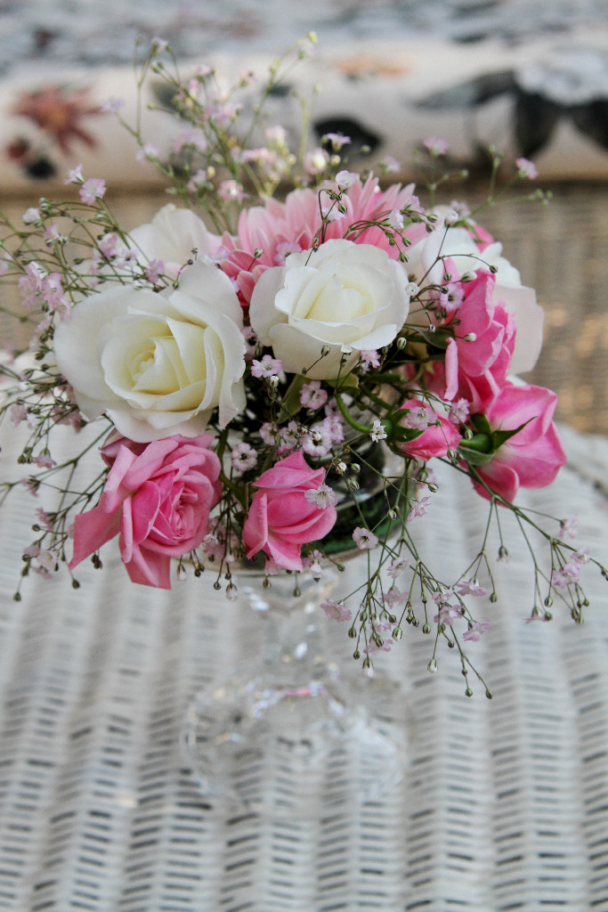 A quick stop at Walmart for some shallow Mason jars, a run by the Dollar Store for some clear candle sticks, and some glass glue I had at home and I had four new vases for $2.00 each! Glue the jar to the pedestal, add a little flower “frog” to hold your flowers upright and you have a lovely centerpiece!
