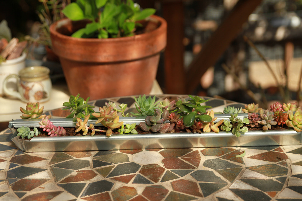 Once you finish filling in with cuttings or small plants (leaving some room for growth) set your container in a bright but not sunny spot and watch it grow!You can bring it indoors for short periods to decorate the table but they really do better outside in bright light.