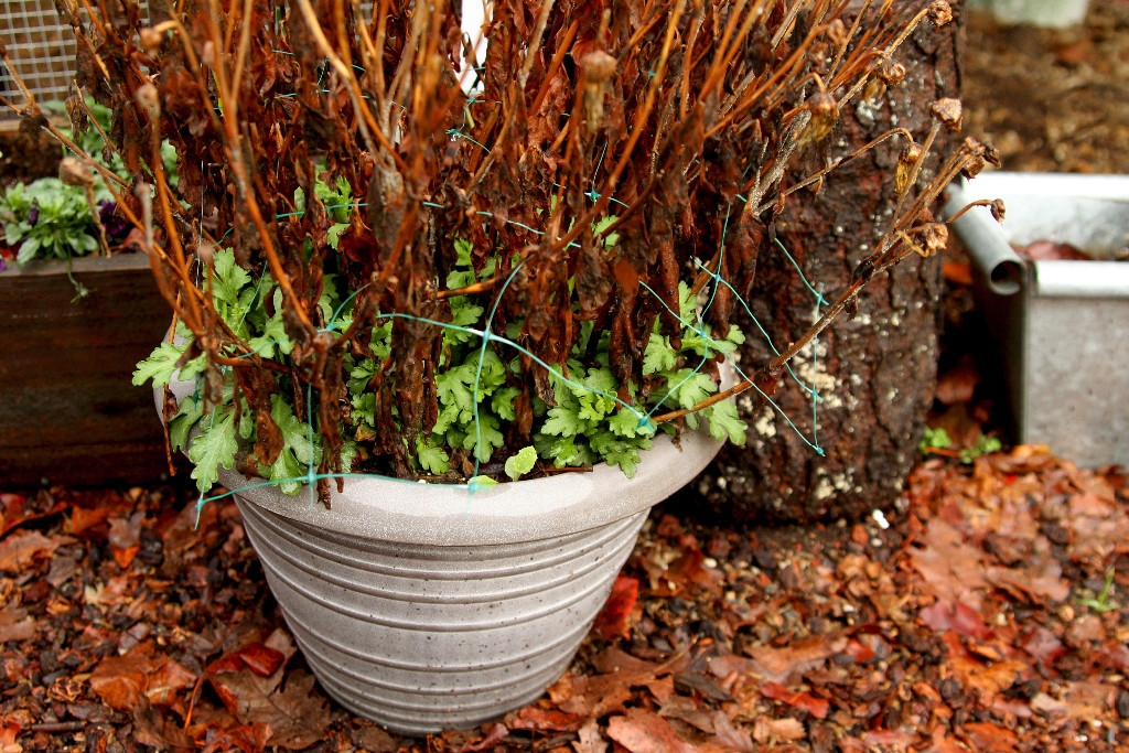 Some plants have green leaves peeking out and it’s tempting to trim back all the dead stuff but wait! It’s actually protecting the new growth from frosts and storm damage and can easily be removed when things warm up. This chrysanthemum is a good example: